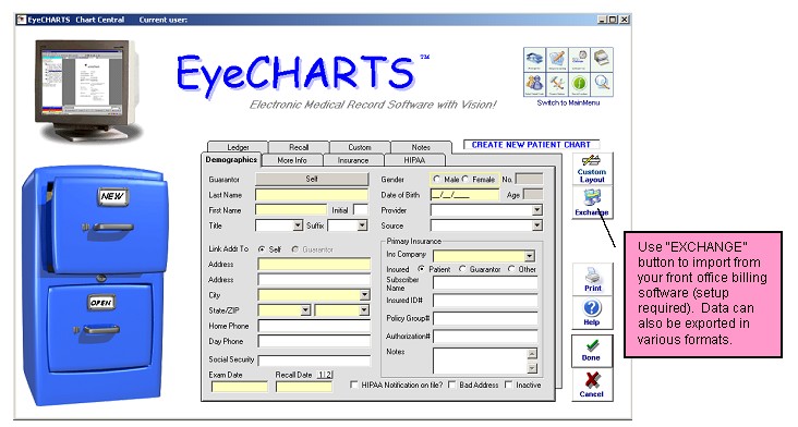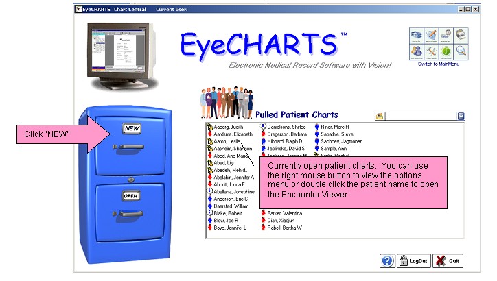 ANSWER: At the main screen (after entering your login password), click on the “NEW” drawer of the patient file cabinet, as shown below: